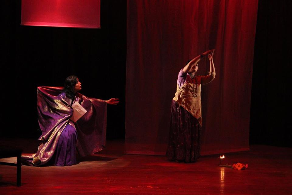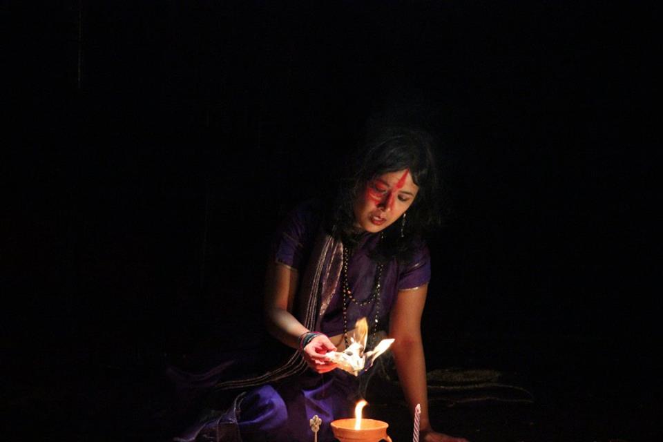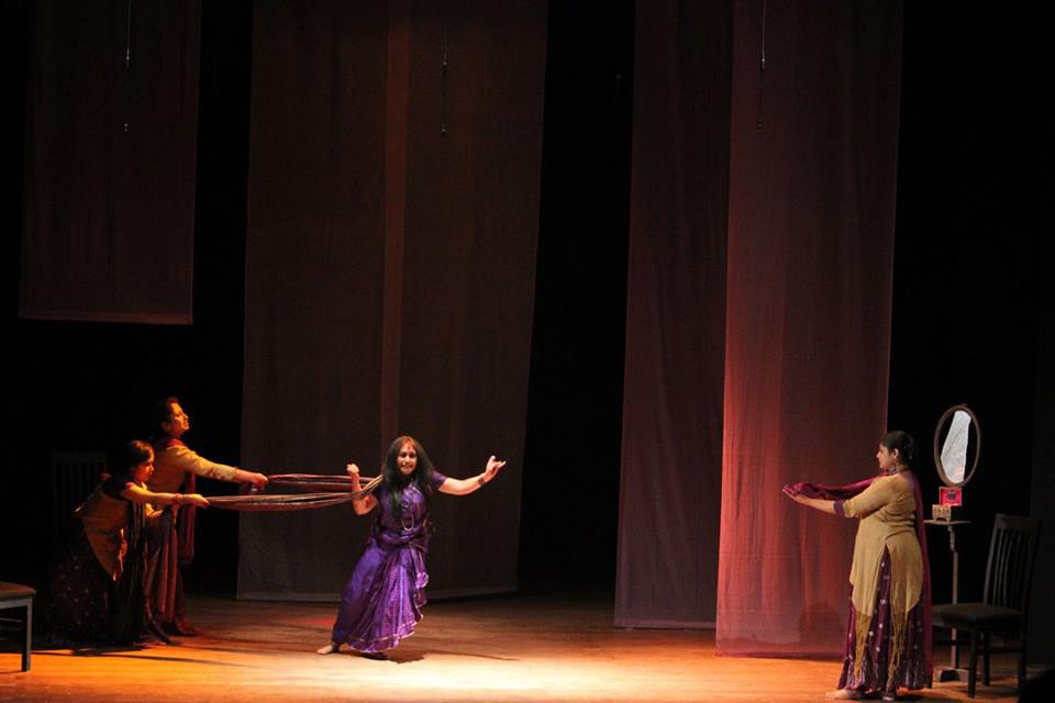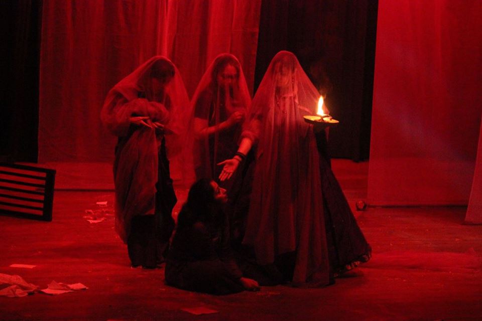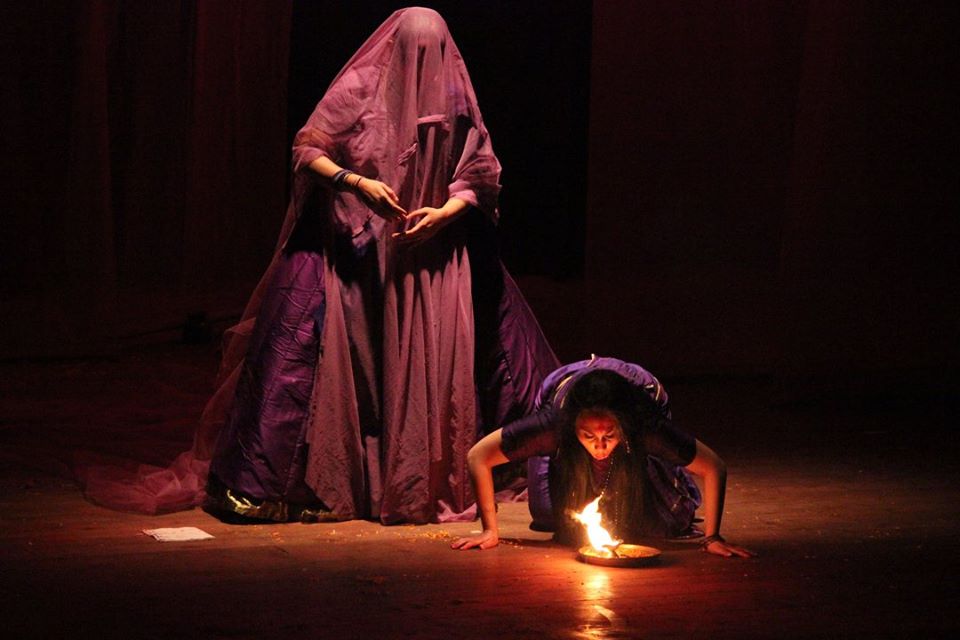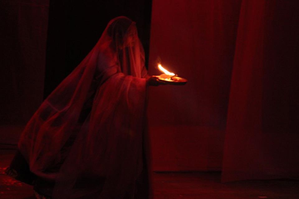 Four performers represent facets of Lady Macbeth in constant conflict to create a fluid performance woven from four strands – a verbal text constructed from the dialogue of the original play, a movement text drawing from dance, a musical text created in response to both words and movement, and a symbolic text crafted from the imagery in Macbeth and the symbolism which imbues Indian classical dance. With references to figures from Indian mythology such as Putana and Shakti, this piece examines what it means to be feminine or de-feminised through the contradictions within this complex character.